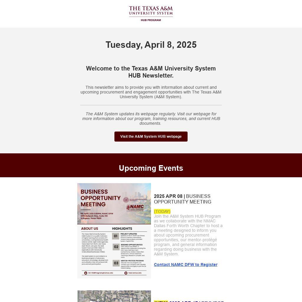 Welcome to the Texas A&M University System HUB Newsletter. |