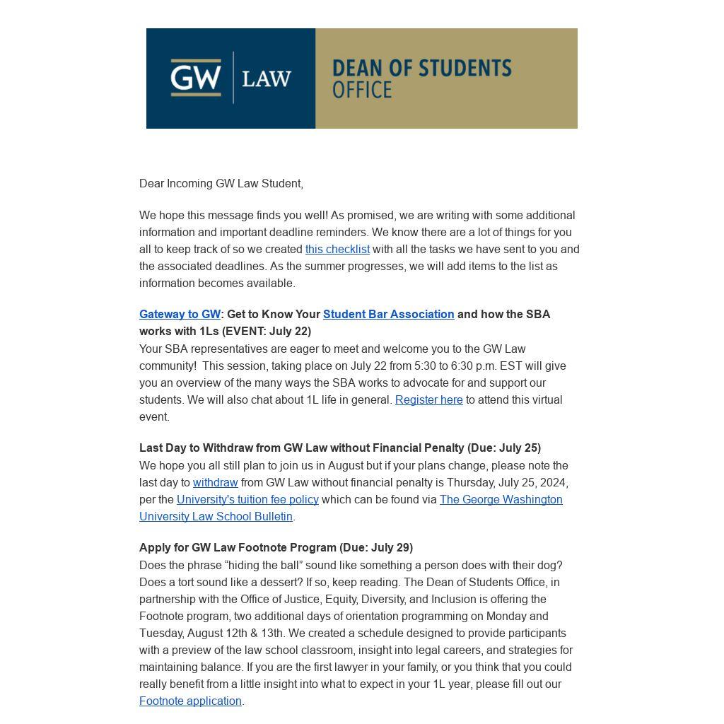 Last Day to Withdraw from GW Law without Financial Penalty (Due: July 25)