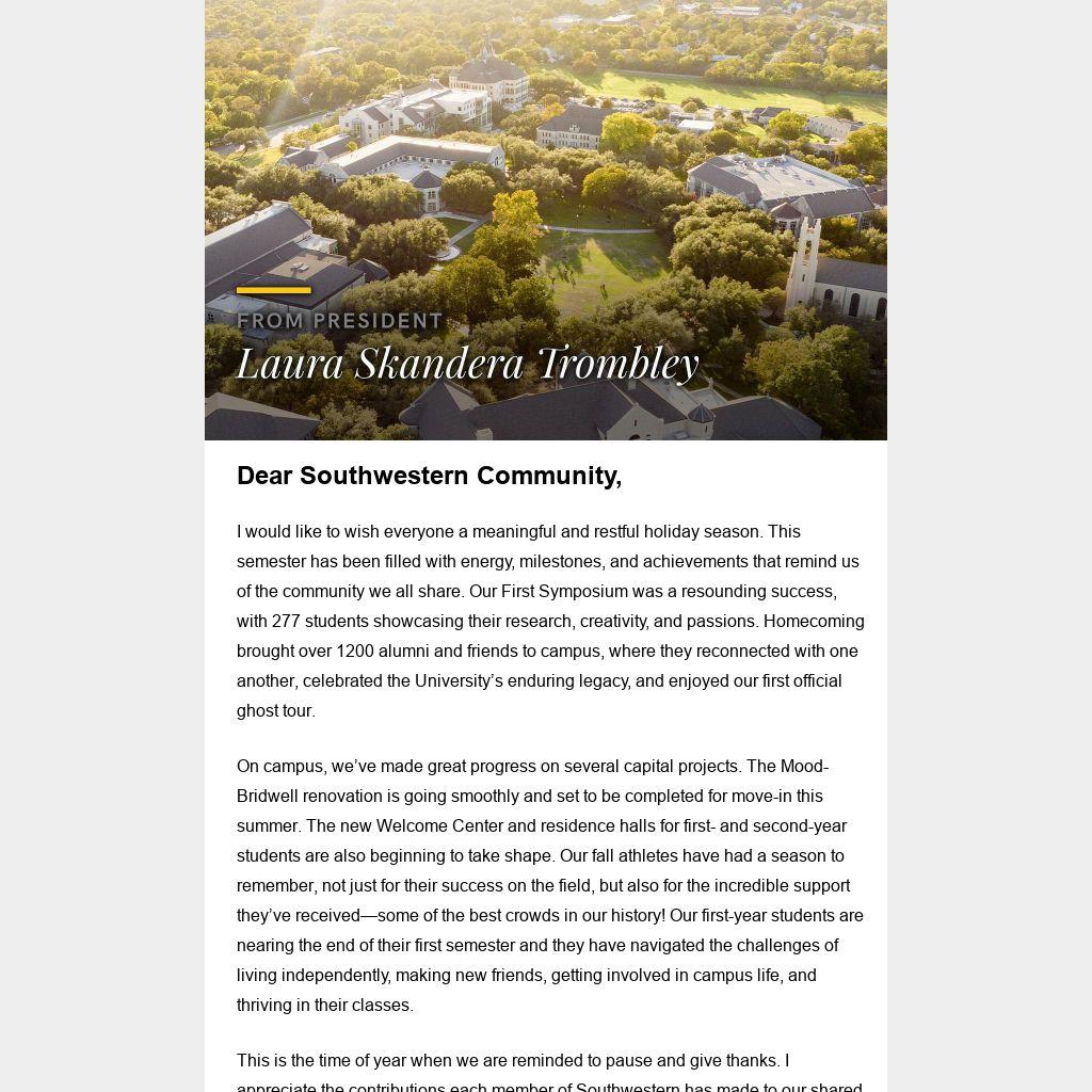 This is the time of year when we are reminded to pause and give thanks. I appreciate the contributions each member of Southwestern has made to our shared success.
