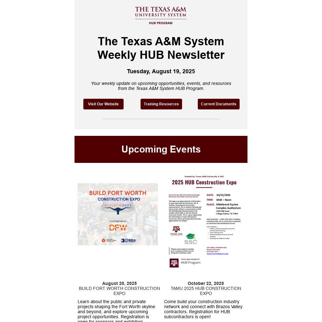 Your weekly update on upcoming opportunities, events, and resources from the Texas A&M System HUB Program.