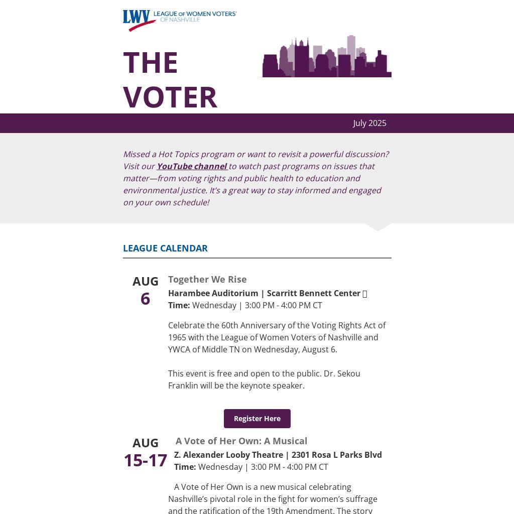 Celebrate the 60th Anniversary of the Voting Rights Act of 1965 with the League of Women Voters of Nashville and YWCA of Middle TN on Wednesday, August 6.