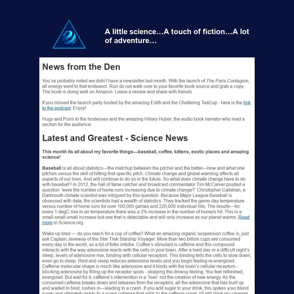 You’ve probably noted we didn’t have a newsletter last month. With the launch of The Paris Contagion, all energy went to that endeavor. Run do not walk over to your favorite book source and grab a copy. The book is doing well on Amazon. Leave a review and share with friends.