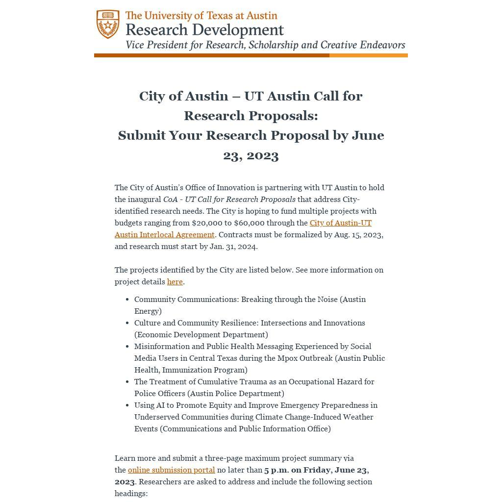 The City of Austin’s Office of Innovation is partnering with UT Austin to hold the inaugural CoA - UT Call for Research Proposals that address City-identified research needs. The City is hoping to fund multiple projects with budgets ranging from $20,000 to $60,000 through the City of Austin-UT Austin Interlocal Agreement. Contracts must be formalized by Aug. 15, 2023, and research must start by Jan. 31, 2024.
