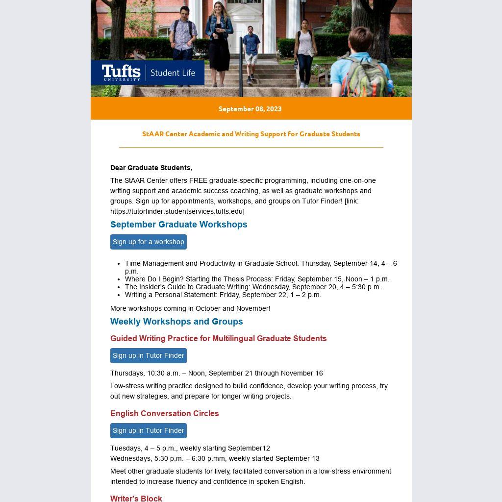 The StAAR Center offers FREE graduate-specific programming, including one-on-one writing support and academic success coaching, as well as graduate workshops and groups. Sign up for appointments, workshops, and groups on Tutor Finder! [link: https://tutorfinder.studentservices.tufts.edu]