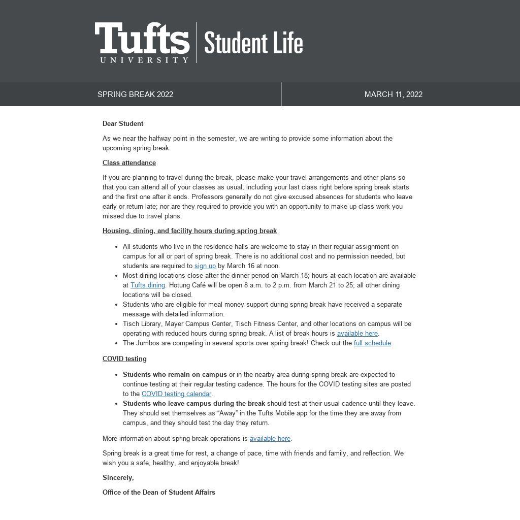 As we near the halfway point in the semester, we are writing to provide some information about the upcoming spring break.