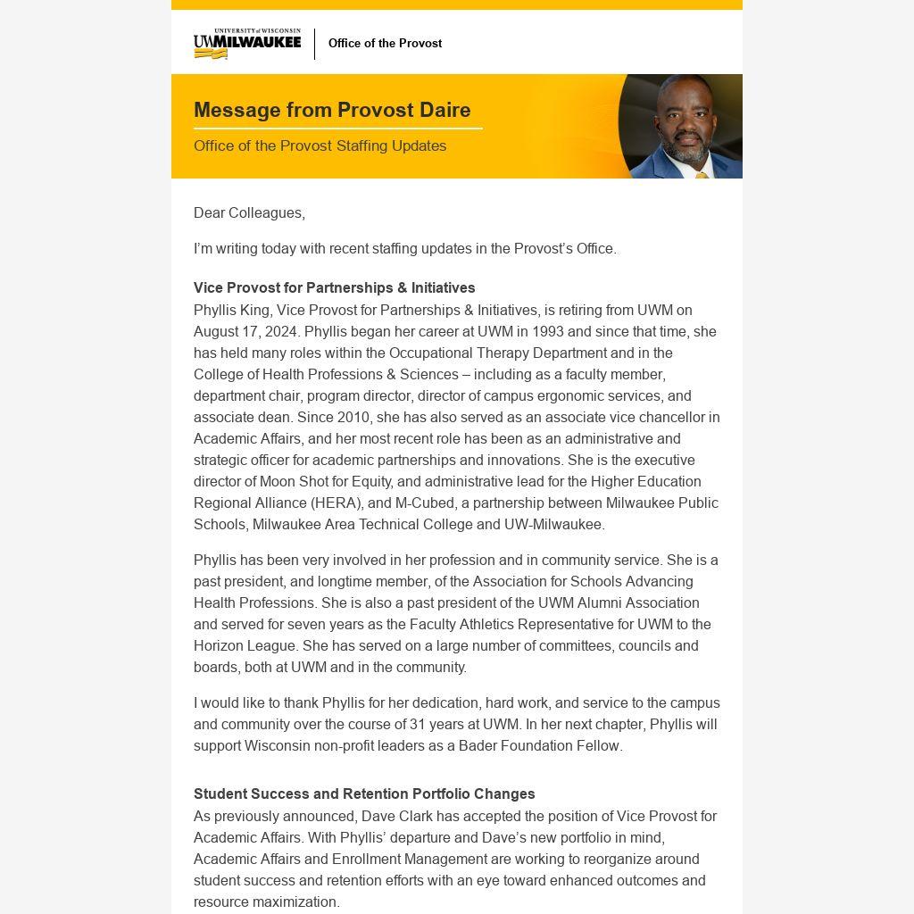 The roles formerly held by Phyllis and Dave will not be backfilled in their previous format. I’ve asked Kay Eilers, Associate Vice Chancellor – Enrollment Management, to take the lead on incorporating these responsibilities into a refreshed enrollment management structure with a specific focus on student success. This realignment creates opportunity for UWM to ensure coordination for our retention and student success efforts, ensure we are institutionalizing the work of the M-Cubed, Moon Shot for Equity and HERA initiatives, and advance elements of the academic advising proposal.
