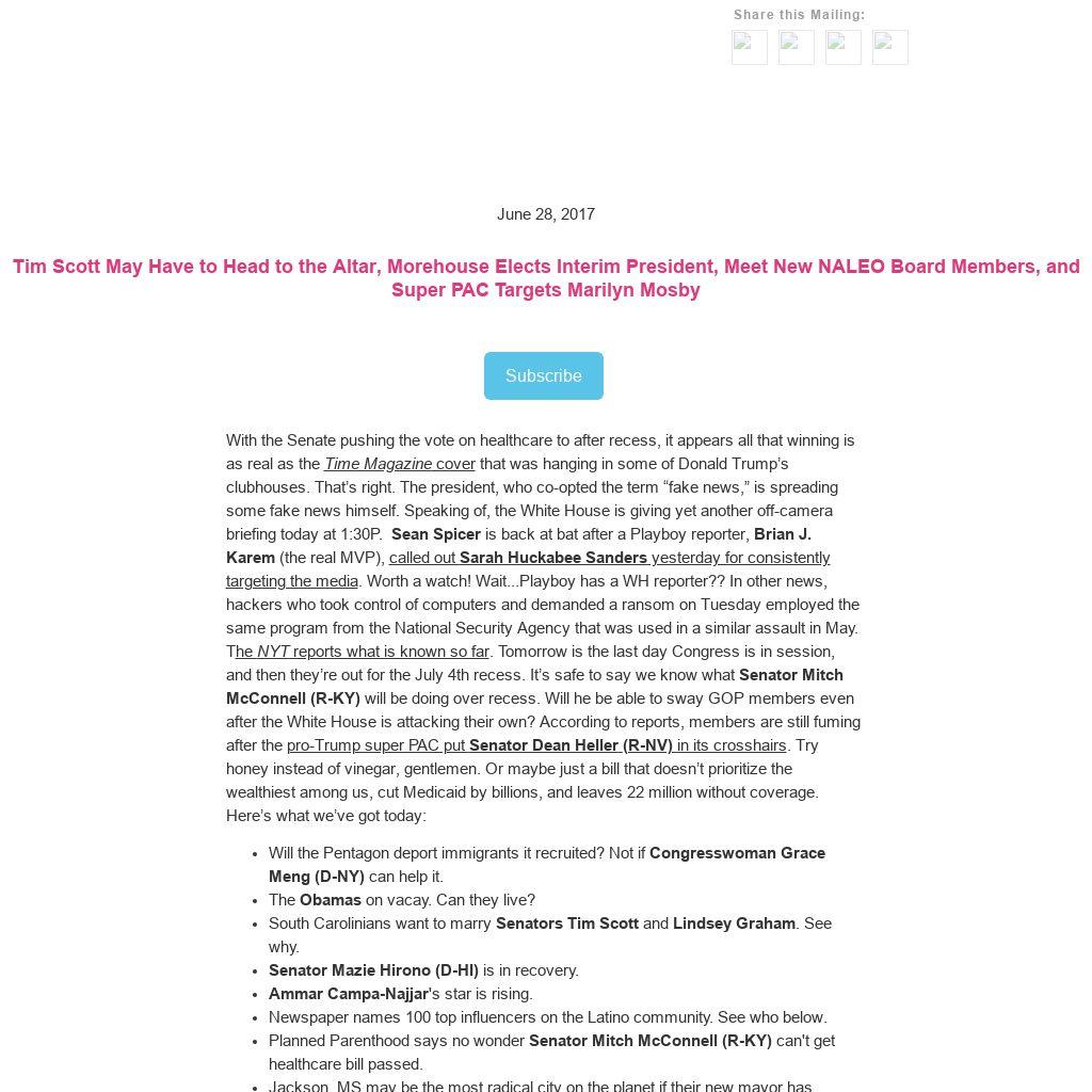 With the Senate pushing the vote on healthcare to after recess, it appears all that winning is as real as the Time Magazine cover that was hanging in some of Donald Trump’s clubhouses. That’s right. The president, who co-opted the term “fake news,” is spreading some fake news himself. Speaking of, the White House is giving yet another off-camera briefing today at 1:30P. Sean Spicer is back at bat after a Playboy reporter, Brian J. Karem (the real MVP), called out Sarah Huckabee Sanders yesterday for consistently targeting the media. Worth a watch! Wait...Playboy has a WH reporter?? In other news, hackers who took control of computers and demanded a ransom on Tuesday employed the same program from the National Security Agency that was used in a similar assault in May. The NYT reports what is known so far. Tomorrow is the last day Congress is in session, and then they’re out for the July 4th recess. It’s safe to say we know what Senator Mitch McConnell (R-KY) will be doing over recess. Will he be able to sway GOP members even after the White House is attacking their own? According to reports, members are still fuming after the pro-Trump super PAC put Senator Dean Heller (R-NV) in its crosshairs. Try honey instead of vinegar, gentlemen. Or maybe just a bill that doesn’t prioritize the wealthiest among us, cut Medicaid by billions, and leaves 22 million without coverage. Here’s what we’ve got today: