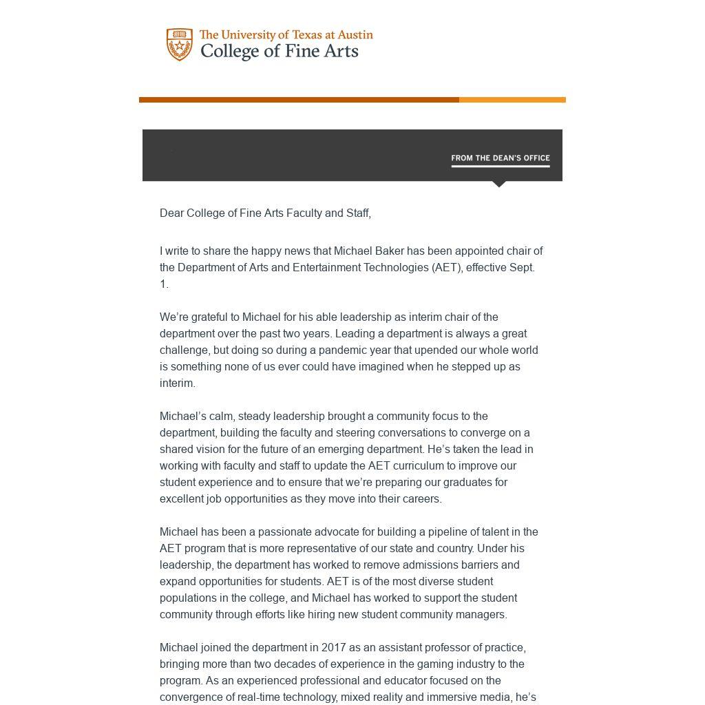 I write to share the happy news that Michael Baker has been appointed chair of the Department of Arts and Entertainment Technologies (AET), effective Sept. 1.