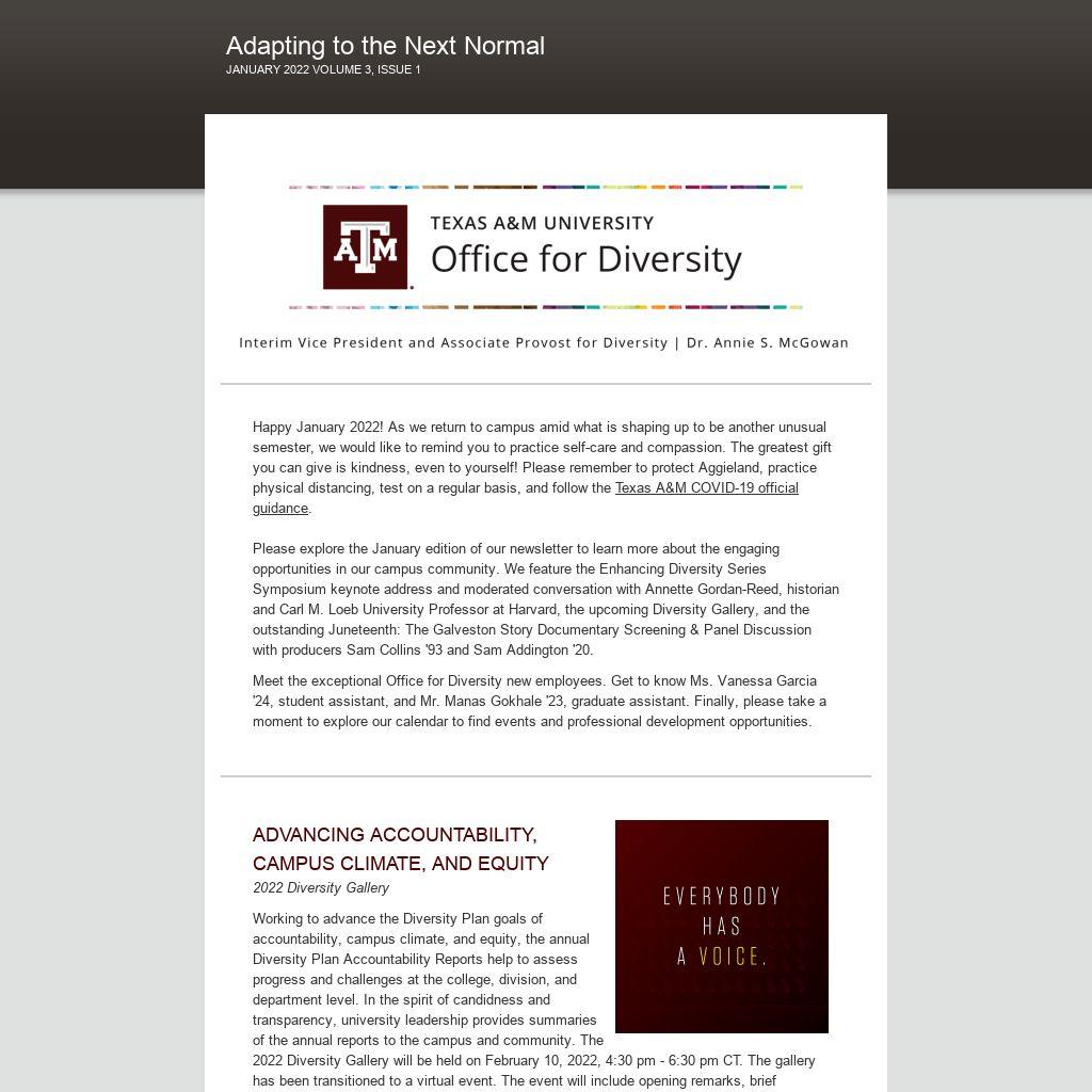 Please explore the January edition of our newsletter to learn more about the engaging opportunities in our campus community. We feature the Enhancing Diversity Series Symposium keynote address and moderated conversation with Annette Gordan-Reed, historian and Carl M. Loeb University Professor at Harvard, the upcoming Diversity Gallery, and the outstanding Juneteenth: The Galveston Story Documentary Screening & Panel Discussion with producers Sam Collins '93 and Sam Addington '20.