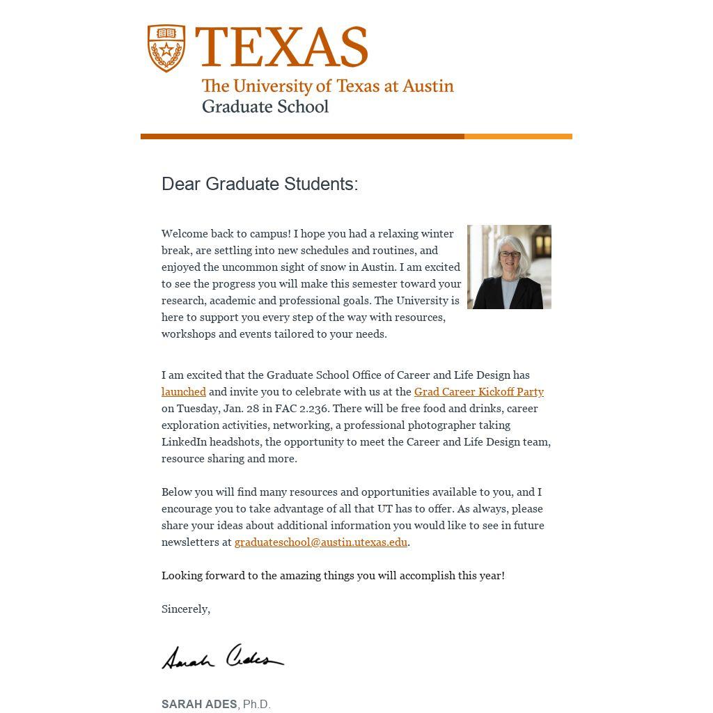 Welcome back to campus! I hope you had a relaxing winter break, are settling into new schedules and routines, and enjoyed the uncommon sight of snow in Austin. I am excited to see the progress you will make this semester toward your research, academic and professional goals. The University is here to support you every step of the way with resources, workshops and events tailored to your needs.