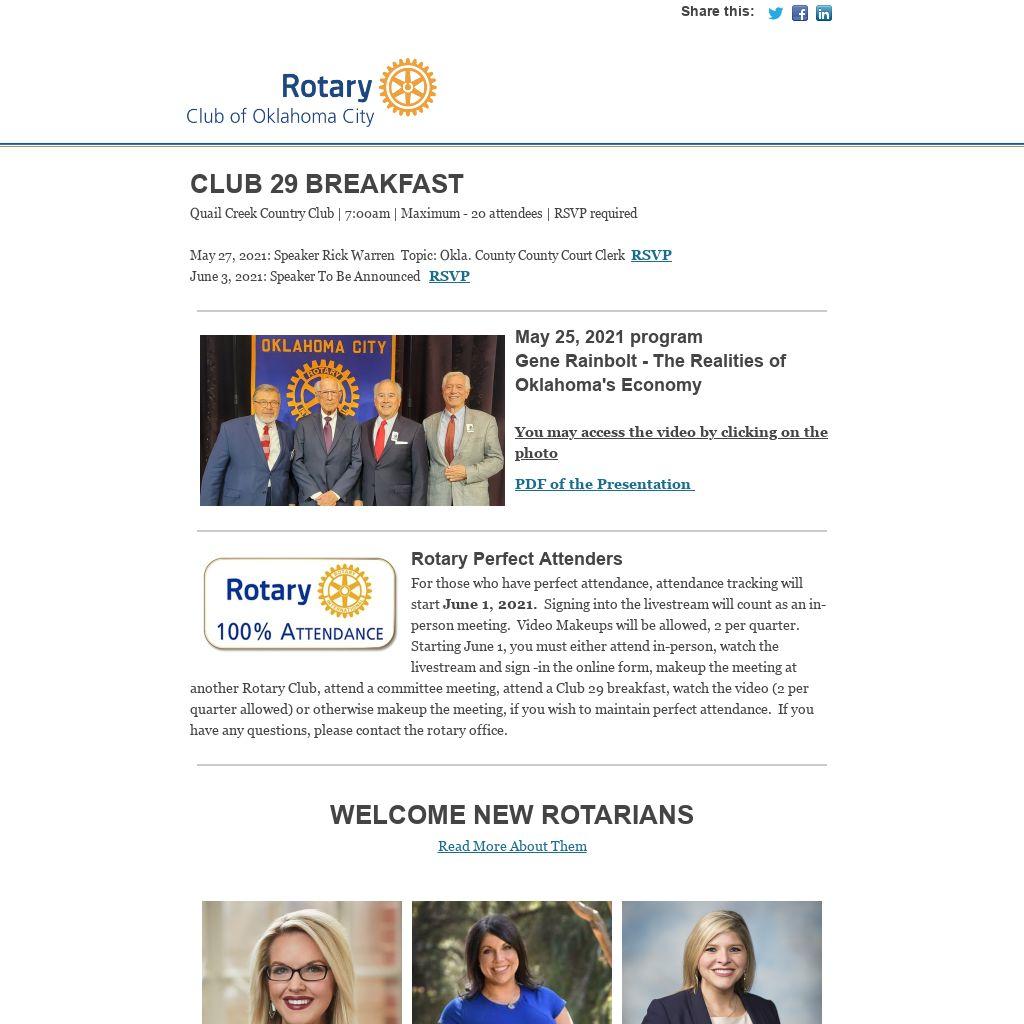 Starting June 1, you must either attend in-person, watch the livestream and sign -in the online form, makeup the meeting at another Rotary Club, attend a committee meeting, attend a Club 29 breakfast, watch the video (2 per quarter allowed) or otherwise makeup the meeting, if you wish to maintain perfect attendance.  If you have any questions, please contact the rotary office.