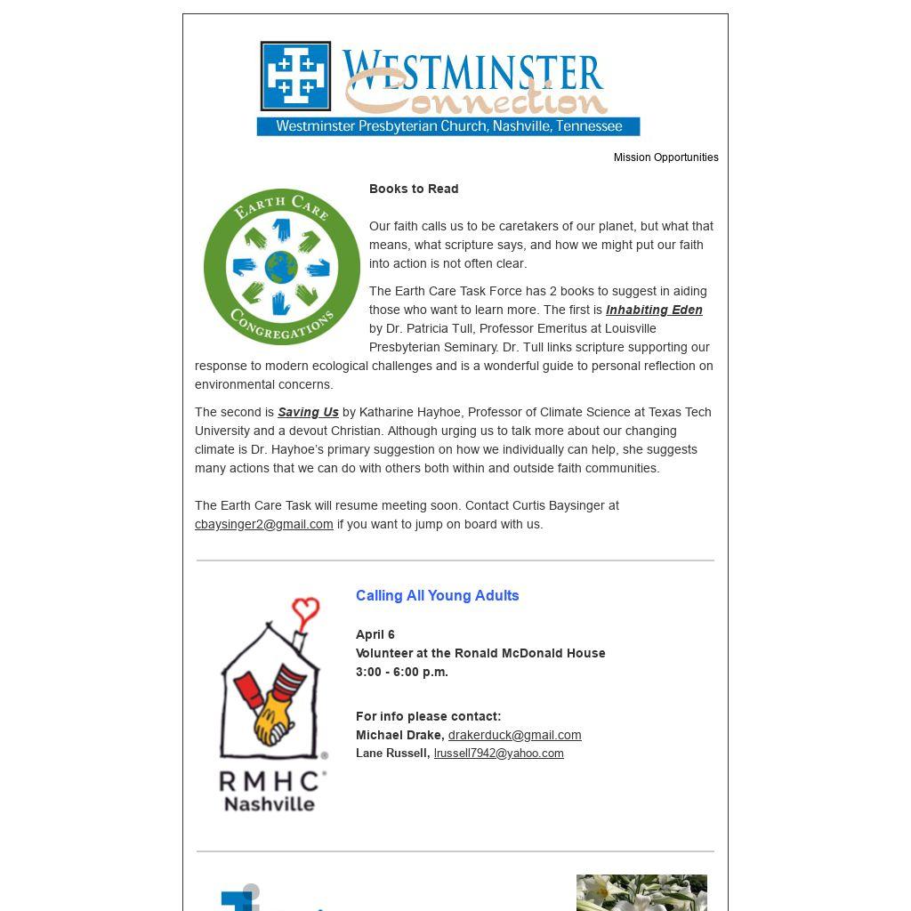 The Earth Care Task will resume meeting soon. Contact Curtis Baysinger at cbaysinger2@gmail.com if you want to jump on board with us.