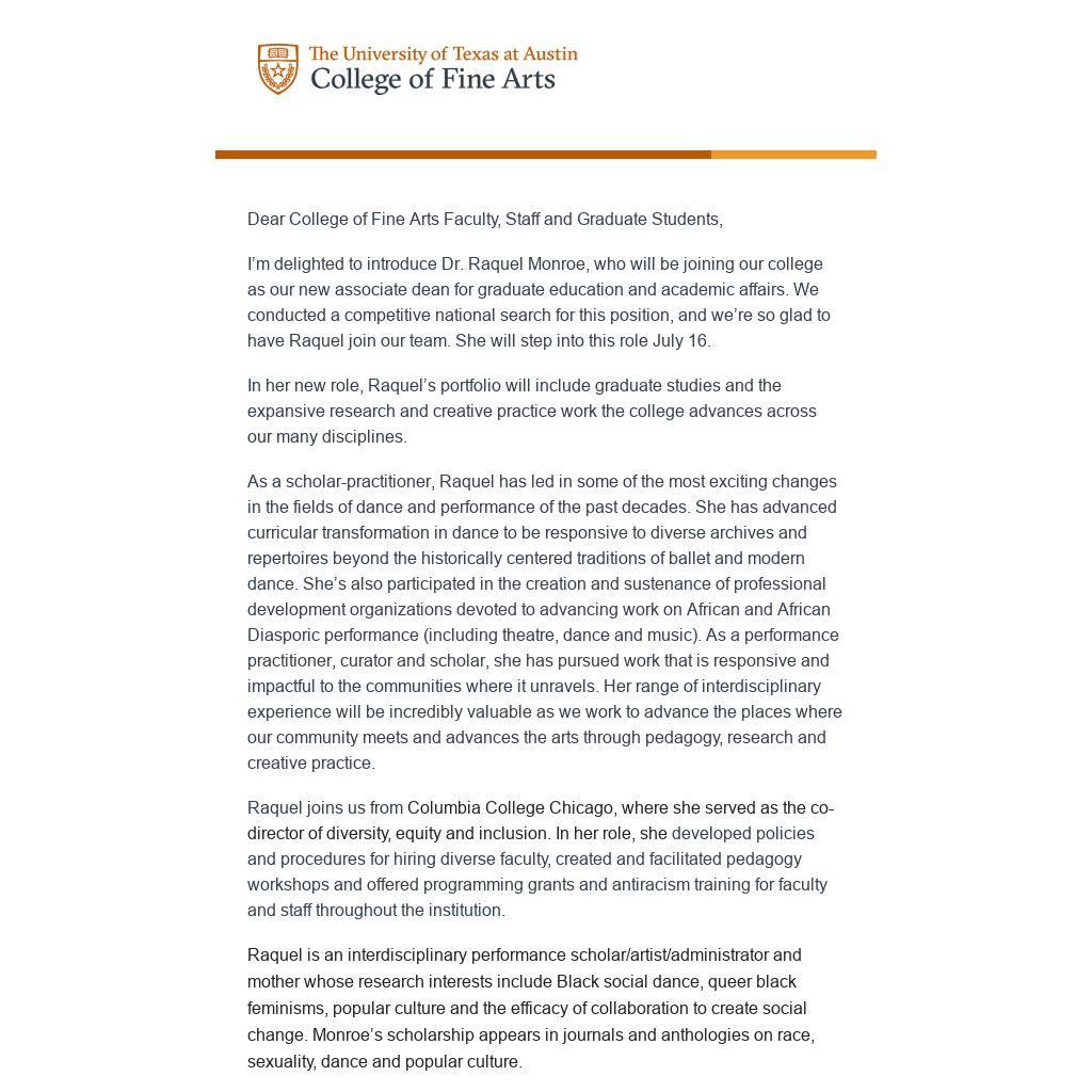 We’re thrilled to welcome Raquel Monroe to the College of Fine Arts, and I hope you’ll join me in extending a warm welcome to her in this role.
