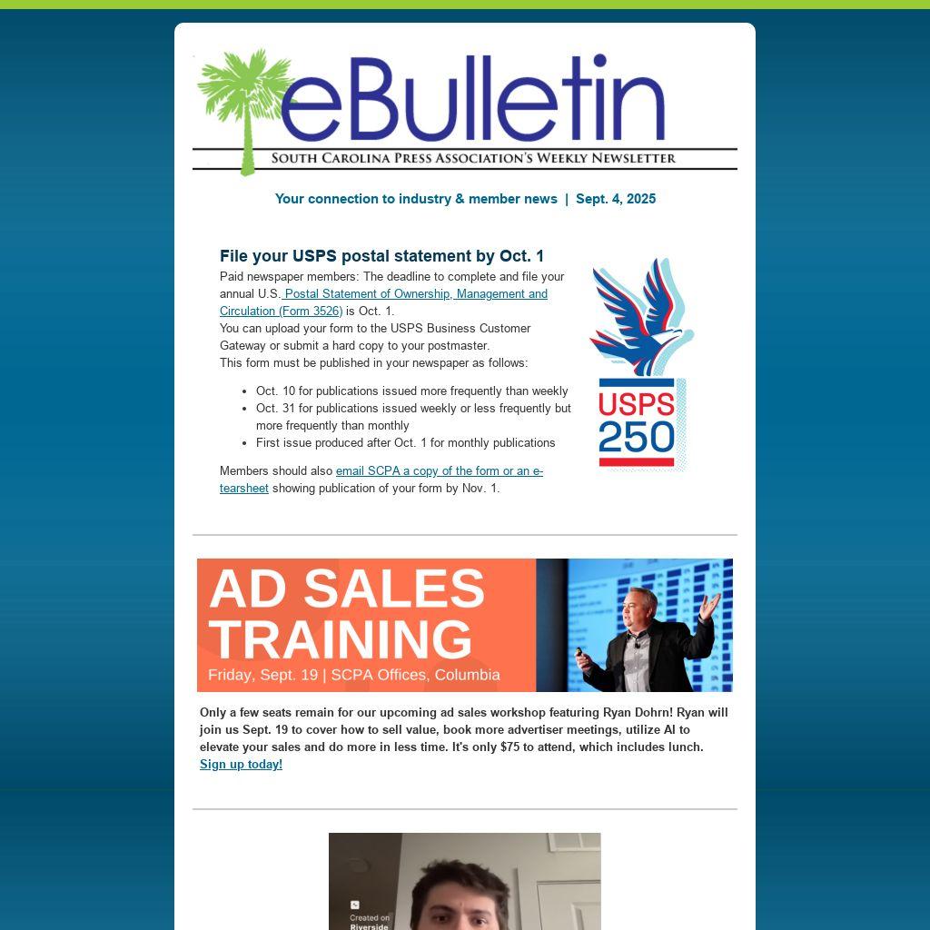 Paid newspaper members: The deadline to complete and file your annual U.S. Postal Statement of Ownership, Management and Circulation (Form 3526) is Oct. 1.