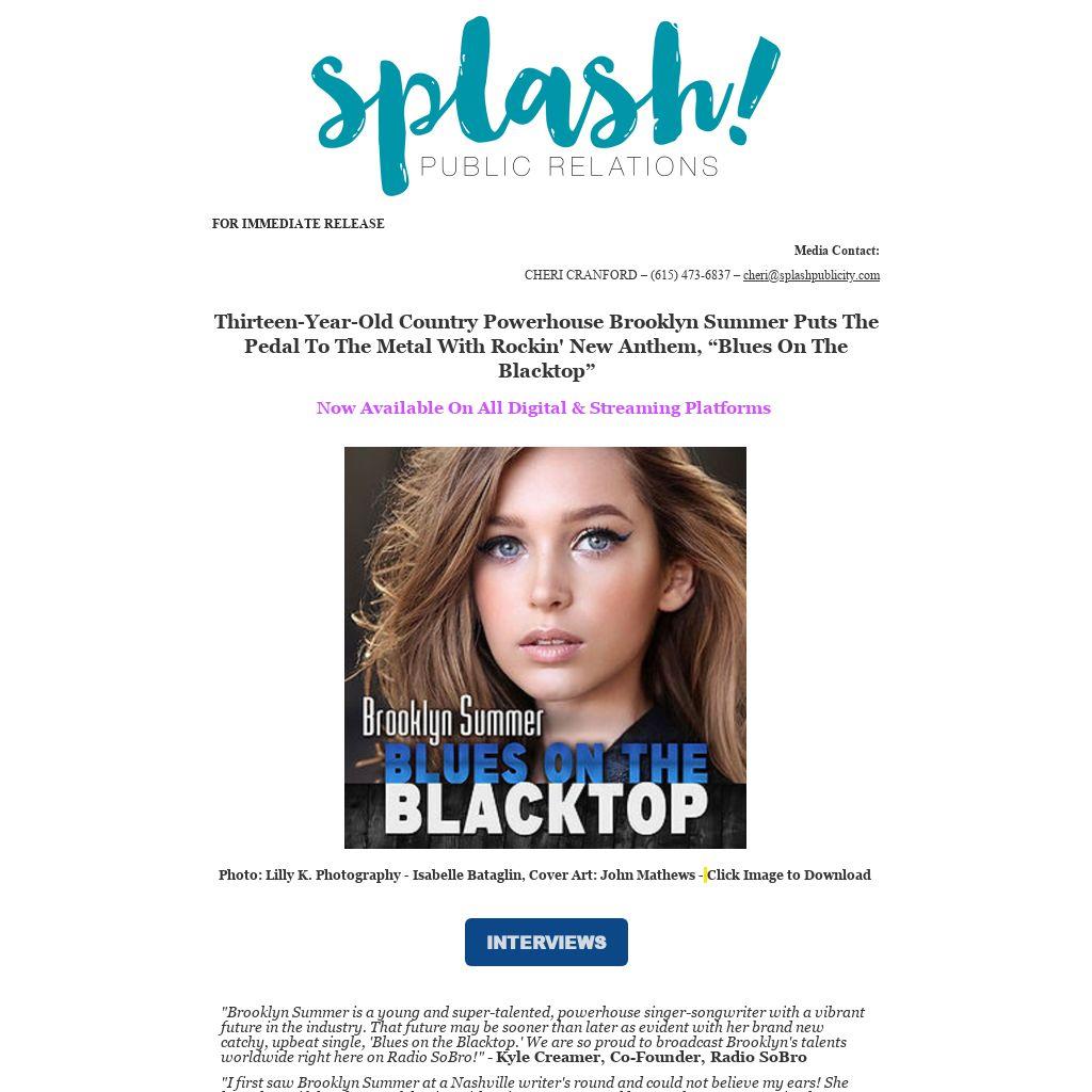 (Nashville, TN. – May 22, 2023) – Thirteen-year-old country powerhouse singer/songwriter Brooklyn Summer just released her rockin' new anthem, “Blues On The Blacktop.” The kickin’ up-tempo song was co-written with Nashville tunesmiths Dave Lenahan, Scott Barrier, and Ericca Latza, and was produced by industry vet, John D. Willis, Mount Willis Productions. It is already creating a buzz among industry professionals and music fans alike since its release day premiere on Radio SoBro's NuMu Friday. "Blues On The Blacktop" is now available on all digital and streaming platforms. Listen HERE.