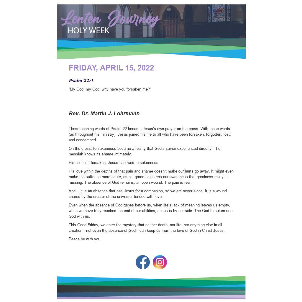 These opening words of Psalm 22 became Jesus’s own prayer on the cross. With these words (as throughout his ministry), Jesus joined his life to all who have been forsaken, forgotten, lost, and condemned.