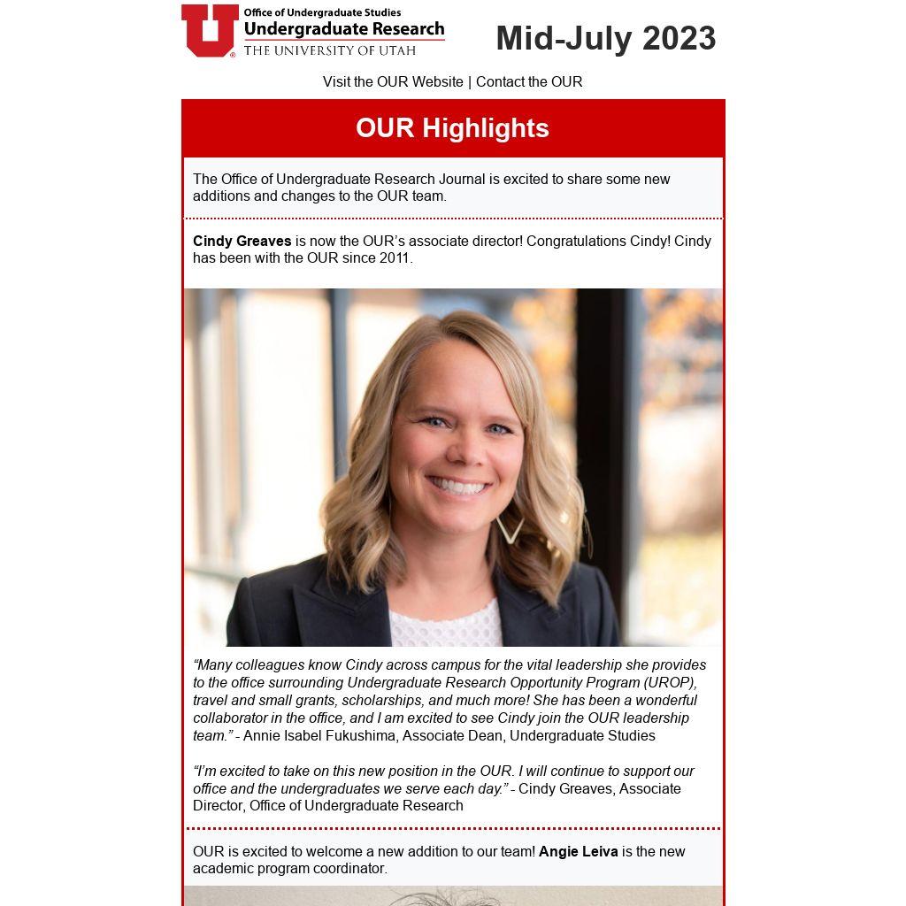 “I’m excited to take on this new position in the OUR. I will continue to support our office and the undergraduates we serve each day.” - Cindy Greaves, Associate Director, Office of Undergraduate Research