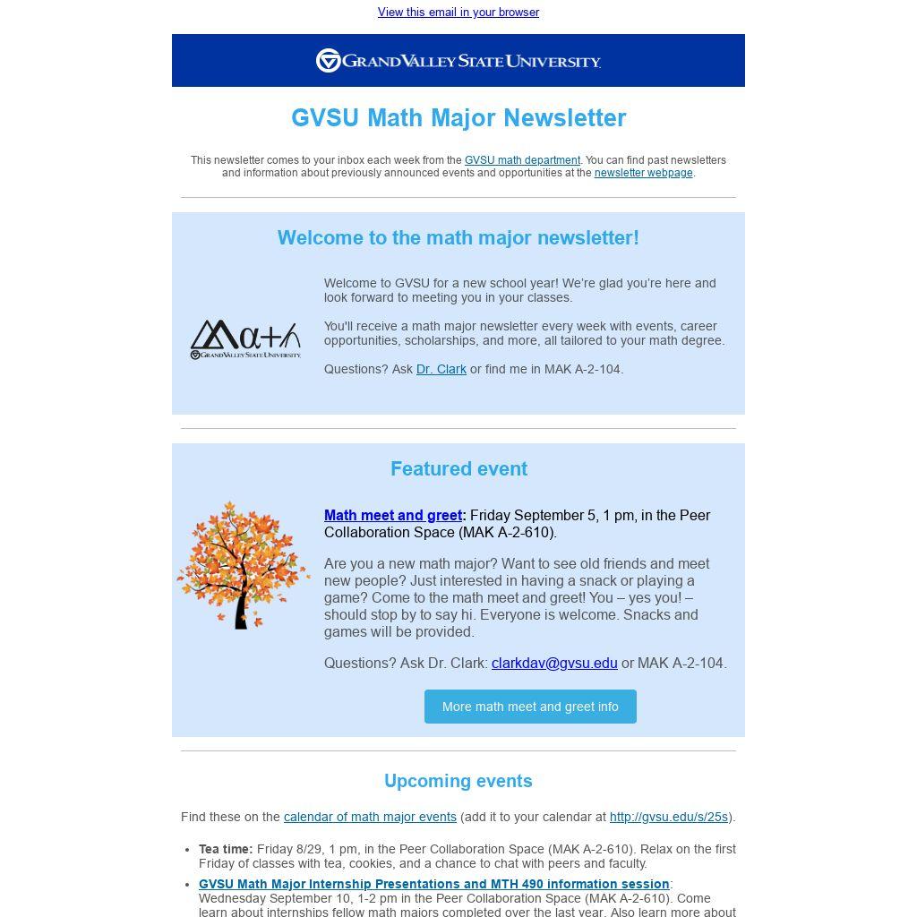 This newsletter comes to your inbox each week from the GVSU math department. You can find past newsletters and information about previously announced events and opportunities at the newsletter webpage.