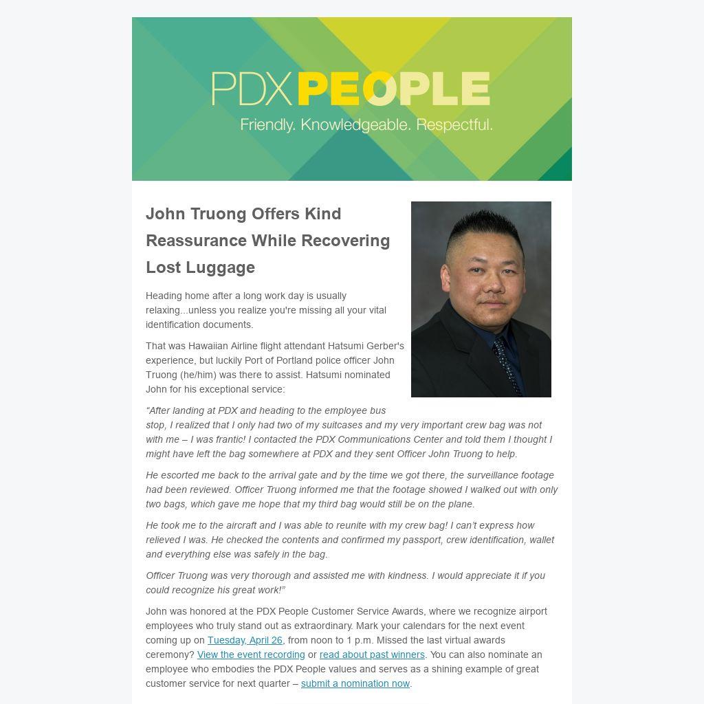 John was honored at the PDX People Customer Service Awards, where we recognize airport employees who truly stand out as extraordinary. Mark your calendars for the next event coming up on Tuesday, April 26, from noon to 1 p.m. Missed the last virtual awards ceremony? View the event recording or read about past winners. You can also nominate an employee who embodies the PDX People values and serves as a shining example of great customer service for next quarter – submit a nomination now.