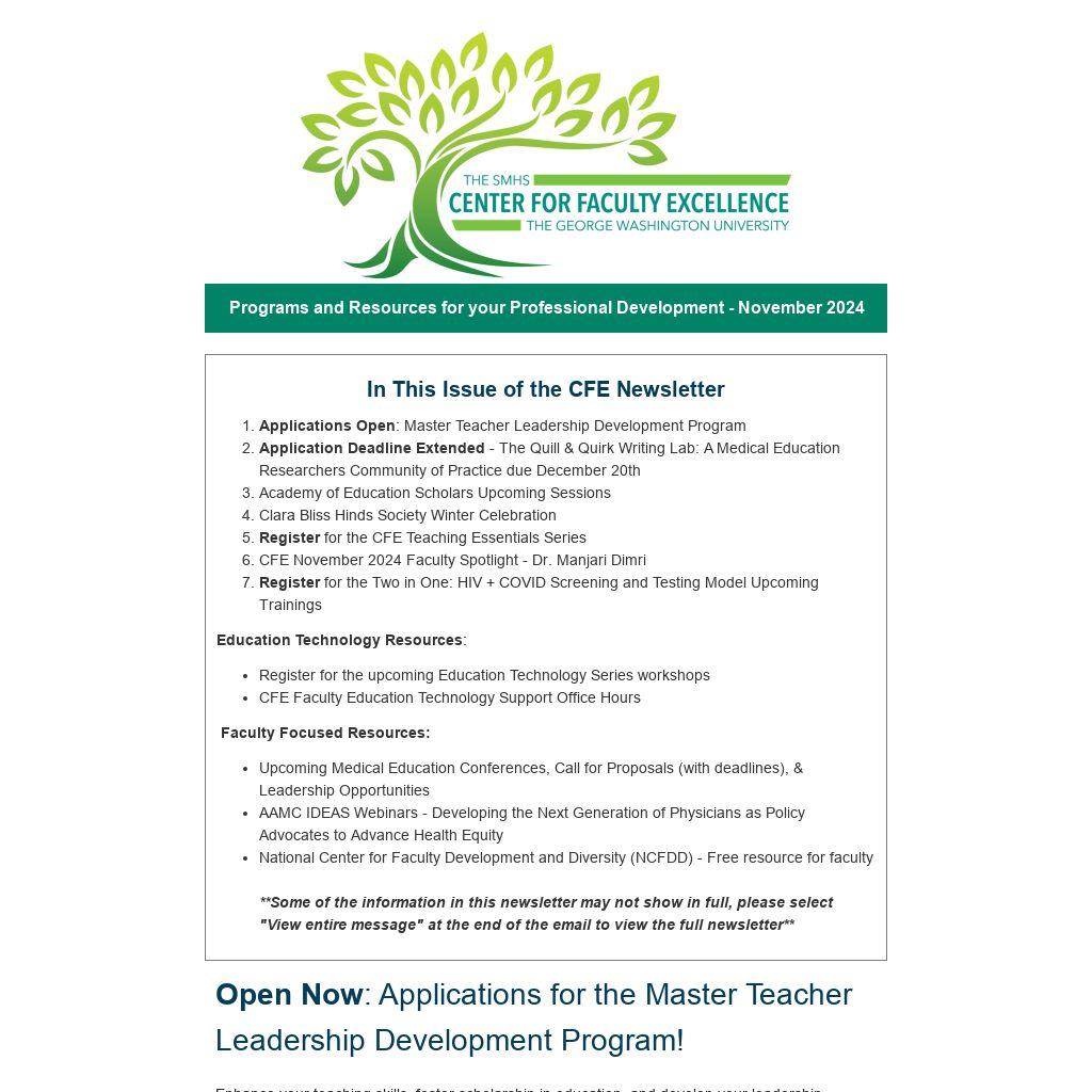 - Enhancing Your Career as a Clinician Educator: Definitions, Challenges, and Opportunities - December 3rd, 2024, from presenter Dr. Larrie Greenberg, MD. This session is virtual. Register for this session here. View full event details here.