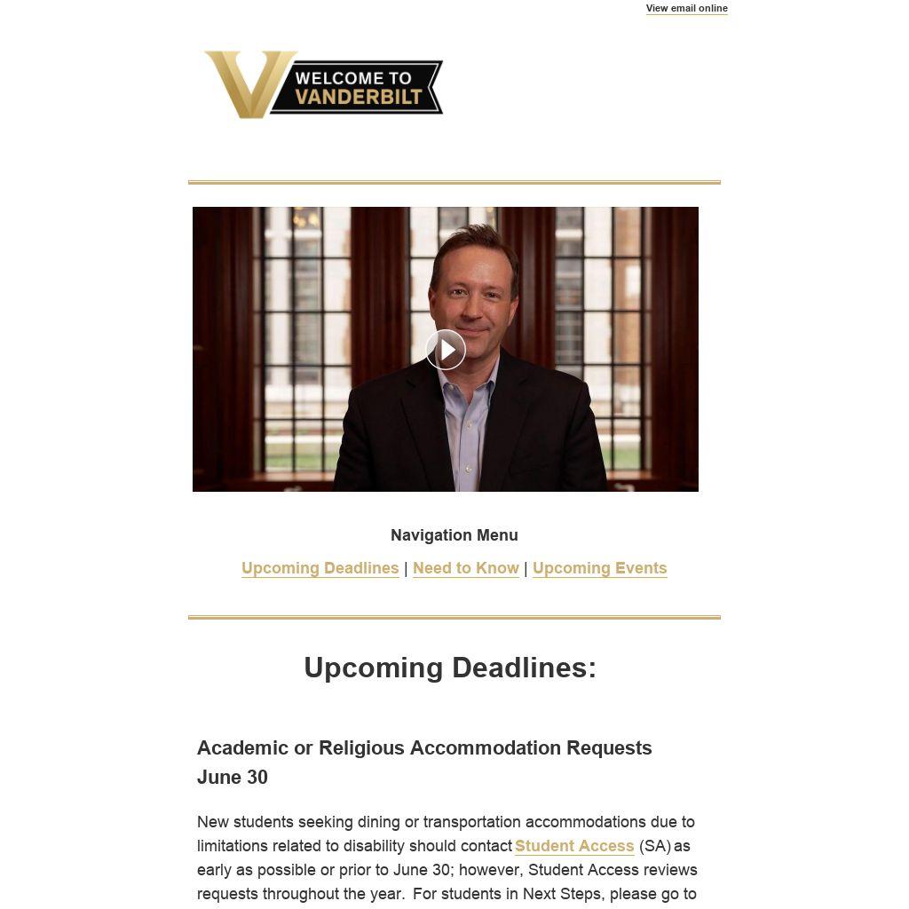 We look forward to hosting you on campus on Monday, June 23, from 9:00 a.m. - 3:00 p.m. Please plan to meet us in the lobby of the Commons. During this summer orientation, you will meet with your advisor, get set up on necessary technology, complete a career exploration activity, and meet campus partners. Lunch will be provided in one of our on-campus dining halls. Please wear comfortable walking shoes and bring your cell phone, laptop, and charger. Be sure to have your VUnetID password saved.