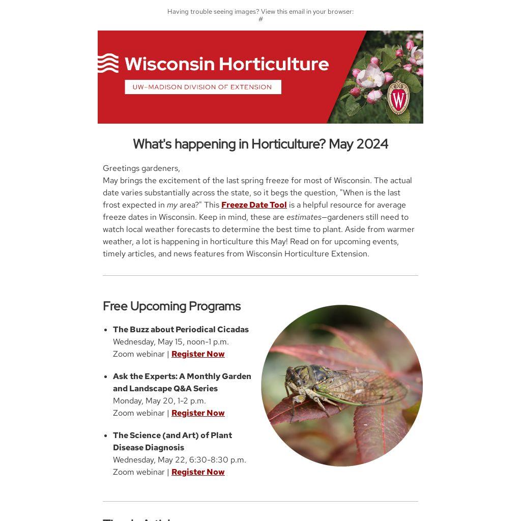 May brings the excitement of the last spring freeze for most of Wisconsin. The actual date varies substantially across the state, so it begs the question, "When is the last frost expected in my area?" This Freeze Date Tool is a helpful resource for average freeze dates in Wisconsin. Keep in mind, these are estimates—gardeners still need to watch local weather forecasts to determine the best time to plant. Aside from warmer weather, a lot is happening in horticulture this May! Read on for upcoming events, timely articles, and news features from Wisconsin Horticulture Extension.