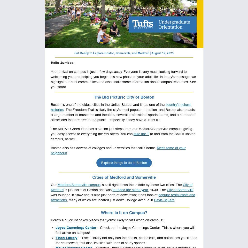 Learn about upcoming events, get reminders about dates and deadlines, and stay in touch with all things Tufts! Follow Orientation on Instagram and join the Class of 2029 Facebook group!