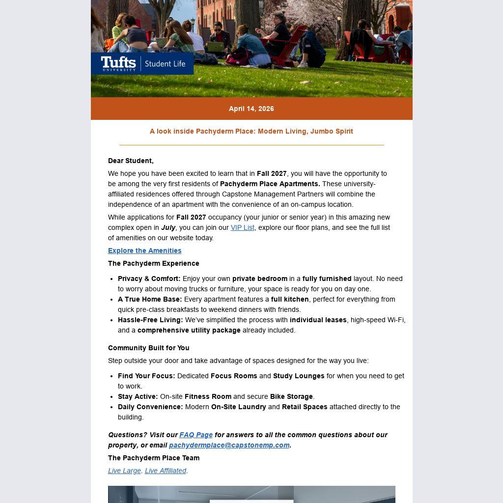 We hope you have been excited to learn that in Fall 2027, you will have the opportunity to be among the very first residents of Pachyderm Place Apartments. These university-affiliated residences offered through Capstone Management Partners will combine the independence of an apartment with the convenience of an on-campus location.