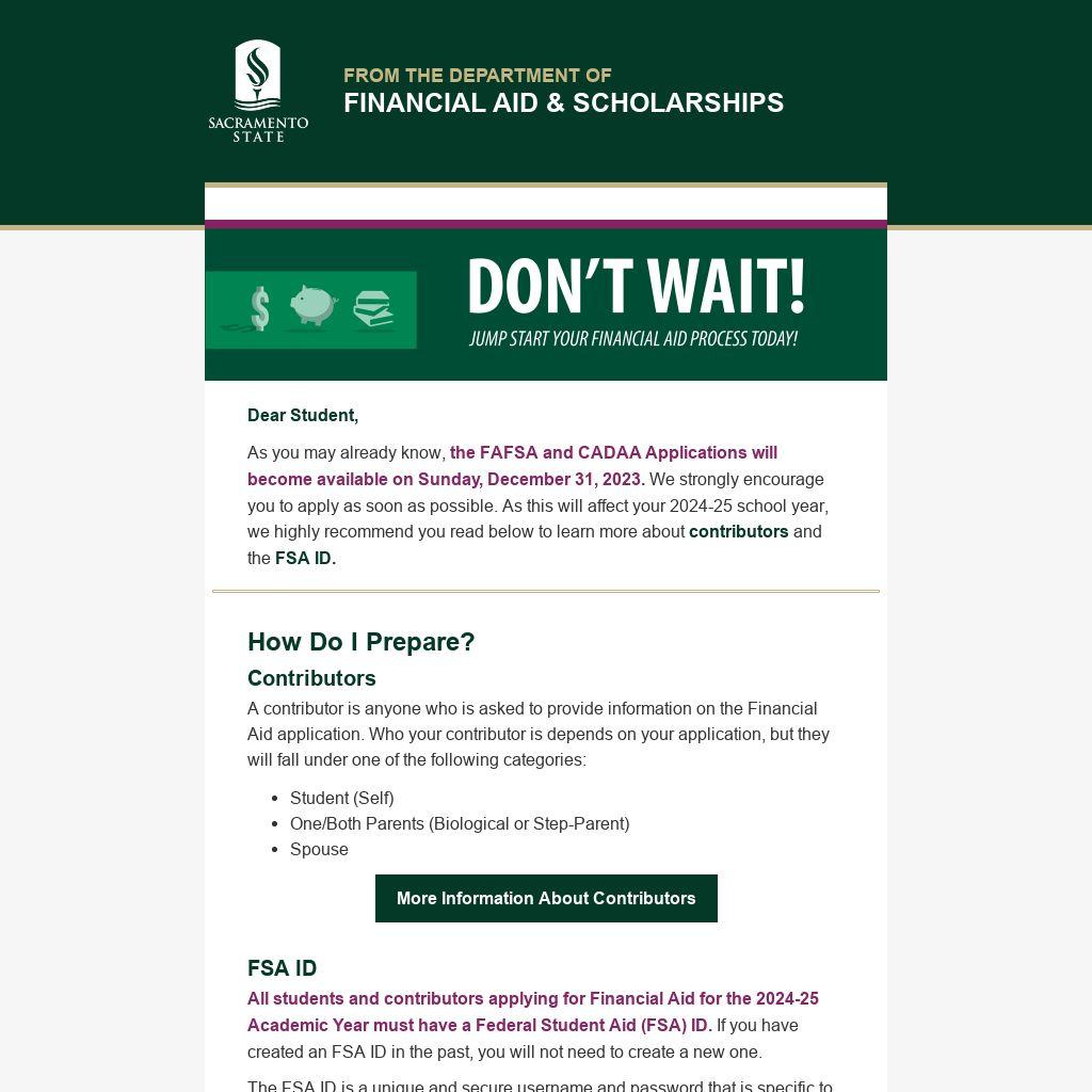 All students and contributors applying for Financial Aid for the 2024-25 Academic Year must have a Federal Student Aid (FSA) ID. If you have created an FSA ID in the past, you will not need to create a new one.