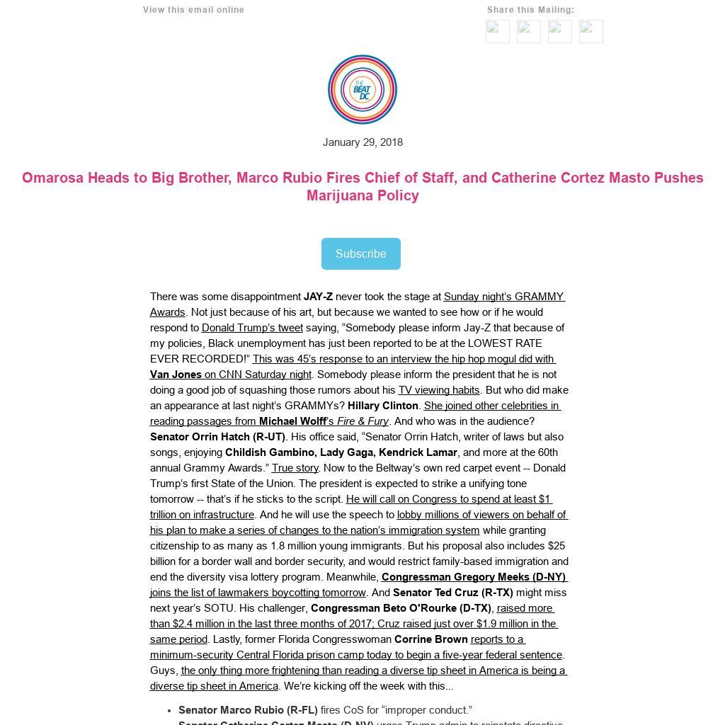 There was some disappointment JAY-Z never took the stage at Sunday night’s GRAMMY Awards. Not just because of his art, but because we wanted to see how or if he would respond to Donald Trump’s tweet saying, “Somebody please inform Jay-Z that because of my policies, Black unemployment has just been reported to be at the LOWEST RATE EVER RECORDED!” This was 45’s response to an interview the hip hop mogul did with Van Jones on CNN Saturday night. Somebody please inform the president that he is not doing a good job of squashing those rumors about his TV viewing habits. But who did make an appearance at last night’s GRAMMYs? Hillary Clinton. She joined other celebrities in reading passages from Michael Wolff’s Fire & Fury. And who was in the audience? Senator Orrin Hatch (R-UT). His office said, “Senator Orrin Hatch, writer of laws but also songs, enjoying Childish Gambino, Lady Gaga, Kendrick Lamar, and more at the 60th annual Grammy Awards.” True story. Now to the Beltway’s own red carpet event -- Donald Trump’s first State of the Union. The president is expected to strike a unifying tone tomorrow -- that’s if he sticks to the script. He will call on Congress to spend at least $1 trillion on infrastructure. And he will use the speech to lobby millions of viewers on behalf of his plan to make a series of changes to the nation’s immigration system while granting citizenship to as many as 1.8 million young immigrants. But his proposal also includes $25 billion for a border wall and border security, and would restrict family-based immigration and end the diversity visa lottery program. Meanwhile, Congressman Gregory Meeks (D-NY) joins the list of lawmakers boycotting tomorrow. And Senator Ted Cruz (R-TX) might miss next year’s SOTU. His challenger, Congressman Beto O'Rourke (D-TX), raised more than $2.4 million in the last three months of 2017; Cruz raised just over $1.9 million in the same period. Lastly, former Florida Congresswoman Corrine Brown reports to a minimum-security Central Florida prison camp today to begin a five-year federal sentence. Guys, the only thing more frightening than reading a diverse tip sheet in America is being a diverse tip sheet in America. We’re kicking off the week with this...