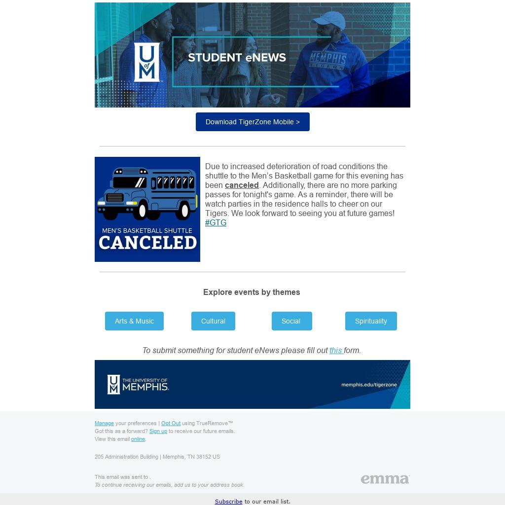 Due to increased deterioration of road conditions the shuttle to the Men’s Basketball game for this evening has been canceled. Additionally, there are no more parking passes for tonight's game. As a reminder, there will be watch parties in the residence halls to cheer on our Tigers. We look forward to seeing you at future games! #GTG