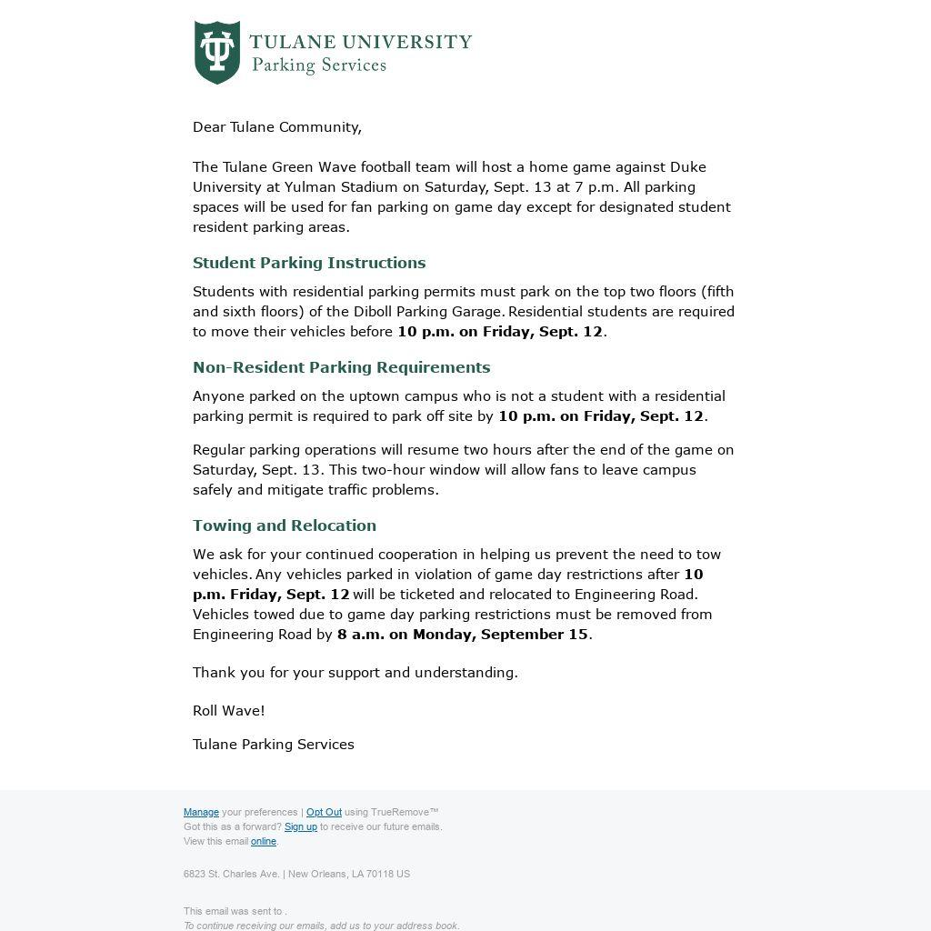 Regular parking operations will resume two hours after the end of the game on Saturday, Sept. 13. This two-hour window will allow fans to leave campus safely and mitigate traffic problems.