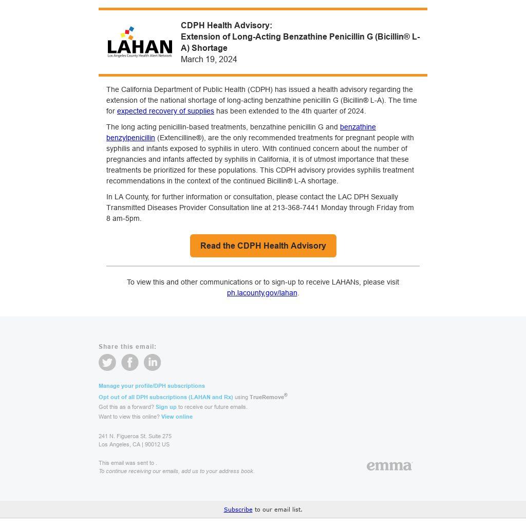 The California Department of Public Health (CDPH) has issued a health advisory regarding the extension of the national shortage of long-acting benzathine penicillin G (Bicillin® L-A). The time for expected recovery of supplies has been extended to the 4th quarter of 2024.