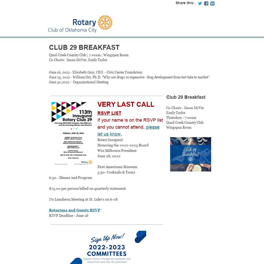 June 28, 2022 - Inauguration of the 2022-2023 Officers and Directors, Wes Milbourn President RSVP