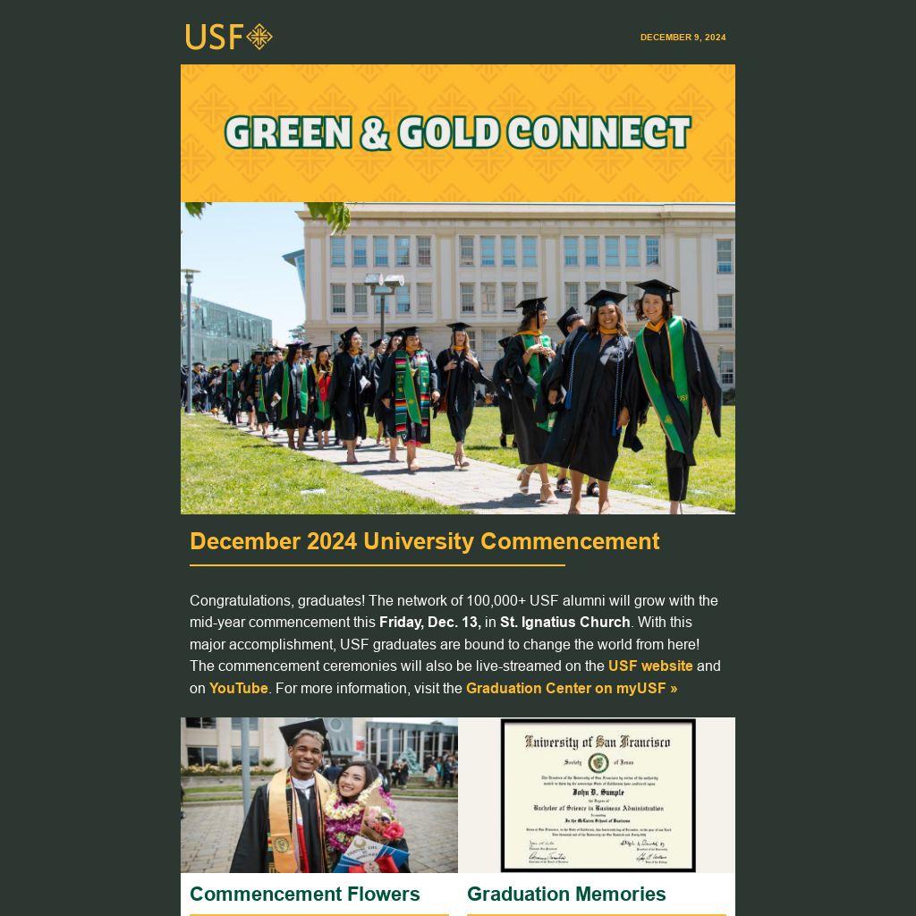 Congratulations, graduates! The network of 100,000+ USF alumni will grow with the mid-year commencement this Friday, Dec. 13, in St. Ignatius Church. With this major accomplishment, USF graduates are bound to change the world from here! The commencement ceremonies will also be live-streamed on the USF website and on YouTube. For more information, visit the Graduation Center on myUSF »