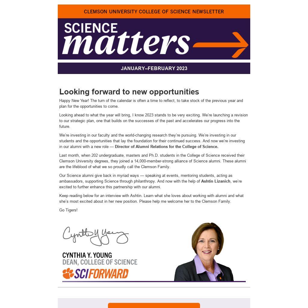Last month, when 202 undergraduate, masters and Ph.D. students in the College of Science received their Clemson University degrees, they joined a 14,000-member-strong alliance of Science alumni. These alumni are the lifeblood of what we so proudly call the Clemson Family.
