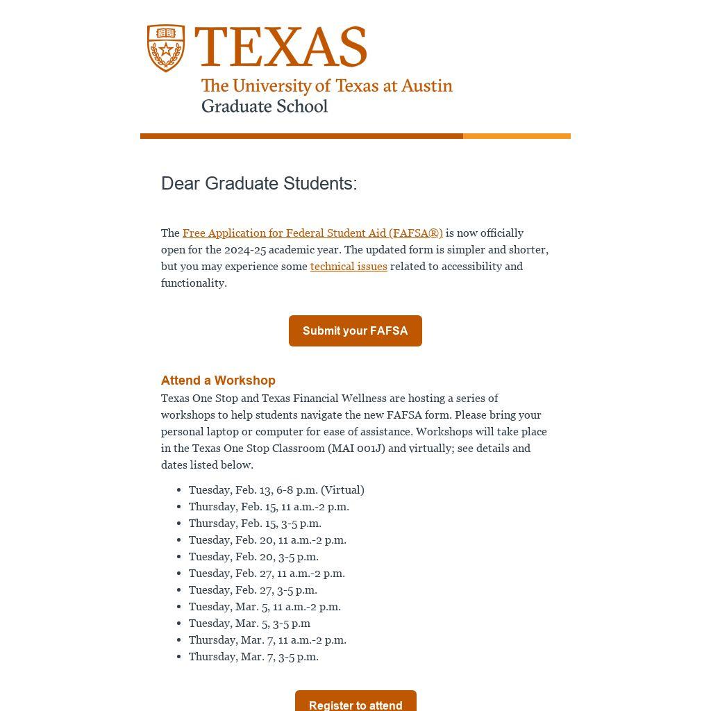 Texas One Stop and Texas Financial Wellness are hosting a series of workshops to help students navigate the new FAFSA form. Please bring your personal laptop or computer for ease of assistance. Workshops will take place in the Texas One Stop Classroom (MAI 001J) and virtually; see details and dates listed below.