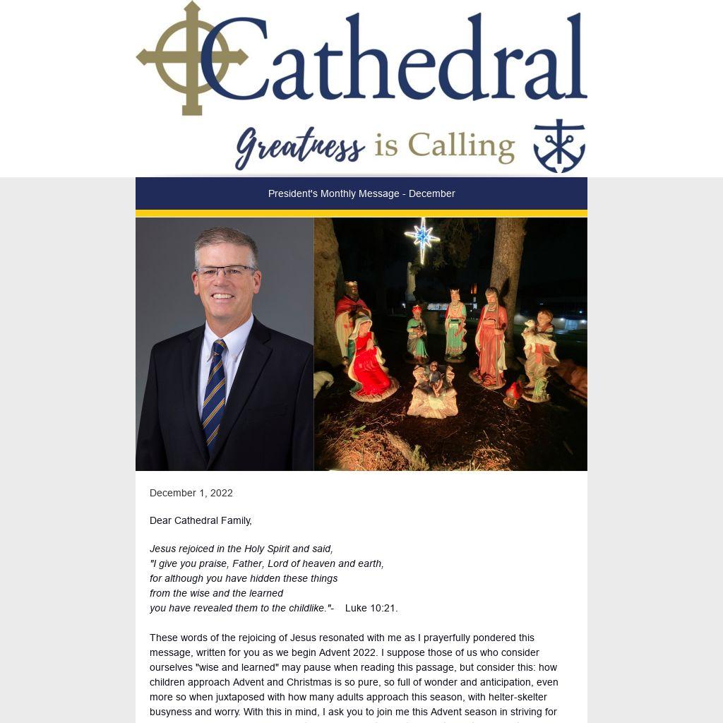 These words of the rejoicing of Jesus resonated with me as I prayerfully pondered this message, written for you as we begin Advent 2022. I suppose those of us who consider ourselves "wise and learned" may pause when reading this passage, but consider this: how children approach Advent and Christmas is so pure, so full of wonder and anticipation, even more so when juxtaposed with how many adults approach this season, with helter-skelter busyness and worry. With this in mind, I ask you to join me this Advent season in striving for "childlike wonder" in our approach to each day, up to and through the entire Advent and Christmas season. After all, here at Cathedral, we work with "big little kids" each day to transform them according to our Mission and Vision. But even with that transformation, we too can be transformed to be more like children in how we look at the world with wonder and awe.