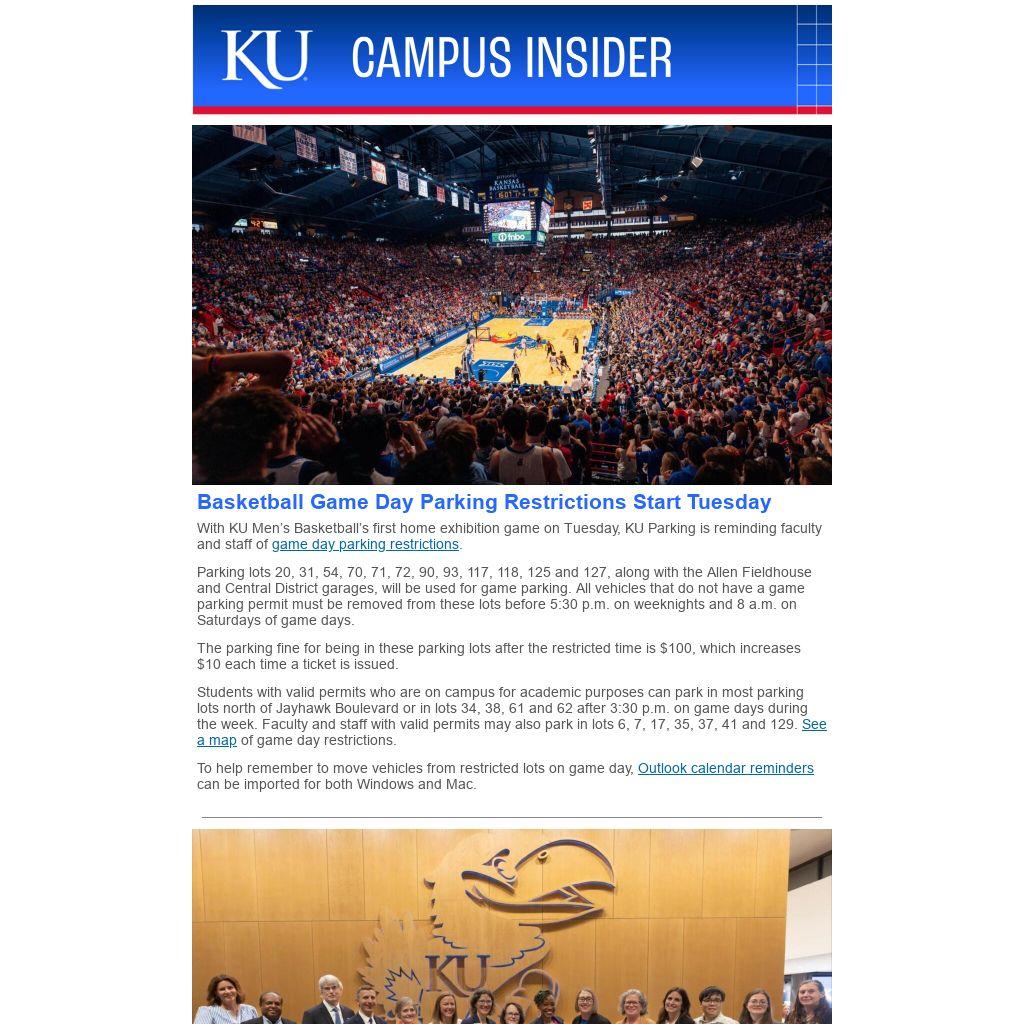 With KU Men’s Basketball’s first home exhibition game on Tuesday, KU Parking is reminding faculty and staff of game day parking restrictions.