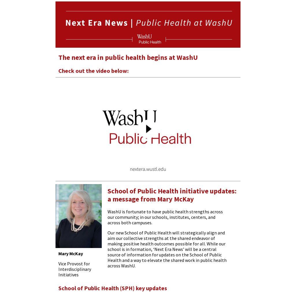 Our new School of Public Health will strategically align and aim our collective strengths at the shared endeavor of making positive health outcomes possible for all. While our school is in formation, ‘Next Era News’ will be a central source of information for updates on the School of Public Health and a way to elevate the shared work in public health across WashU.