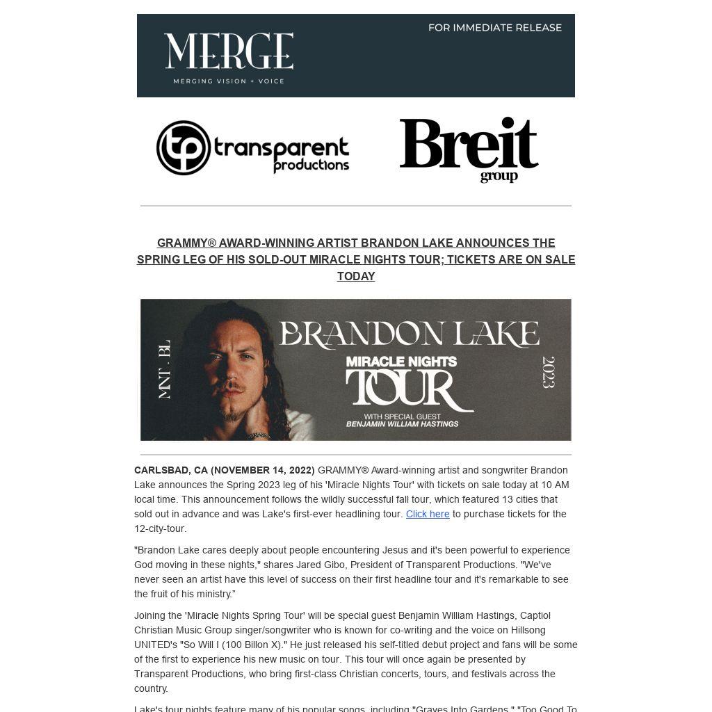 ABOUT BRANDON LAKE: Brandon Lake is a GRAMMY Award-winning artist and songwriter from Charleston, South Carolina. He released his debut album, House Of Miracles, in 2020. For Lake, House Of Miracles is more than an album; it’s the prayer of his life; his prayer is that every home in the world would become a house of miracles. The songs were written to be conduits of hope for everyone who listens.