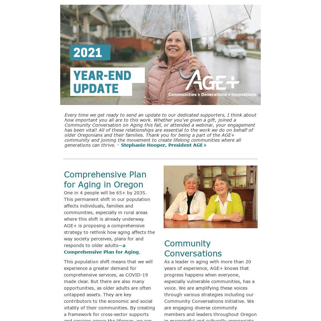 Highlight: The Wasco County Ageless Awards returned in 2021. This event, planned in partnership with the Mid-Columbia Senior Center in The Dalles, celebrated the continued contributions of people 75+ in Wasco County. This year's award recipients were: Sherry Munro, Mary Davis and the Fort Dalles Floozies, Duane and Sue Powell, and Darrell France.