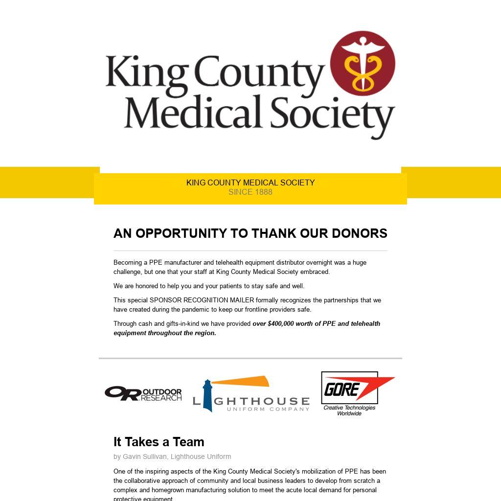One of the inspiring aspects of the King County Medical Society's mobilization of PPE has been the collaborative approach of community and local business leaders to develop from scratch a complex and homegrown manufacturing solution to meet the acute local demand for personal protective equipment.