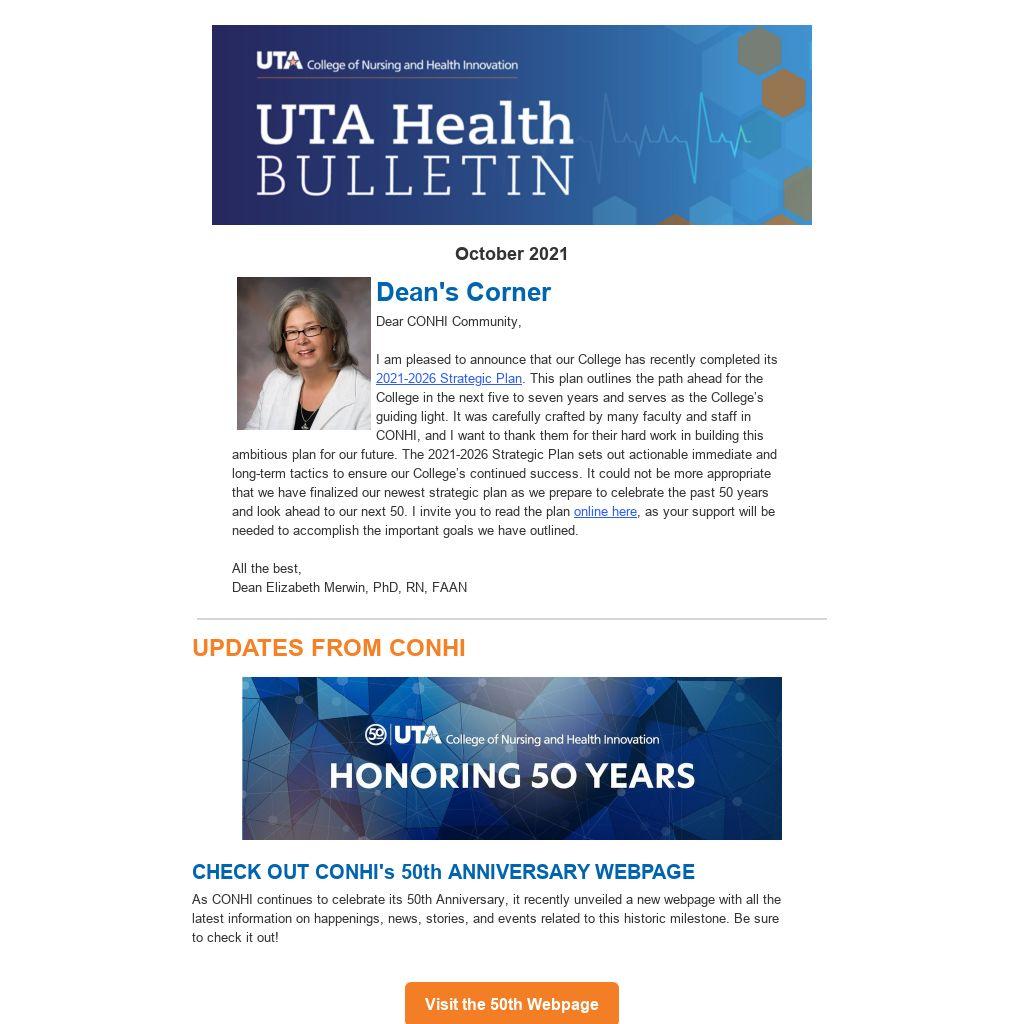 I am pleased to announce that our College has recently completed its 2021-2026 Strategic Plan. This plan outlines the path ahead for the College in the next five to seven years and serves as the College’s guiding light. It was carefully crafted by many faculty and staff in CONHI, and I want to thank them for their hard work in building this ambitious plan for our future. The 2021-2026 Strategic Plan sets out actionable immediate and long-term tactics to ensure our College’s continued success. It could not be more appropriate that we have finalized our newest strategic plan as we prepare to celebrate the past 50 years and look ahead to our next 50. I invite you to read the plan online here, as your support will be needed to accomplish the important goals we have outlined.