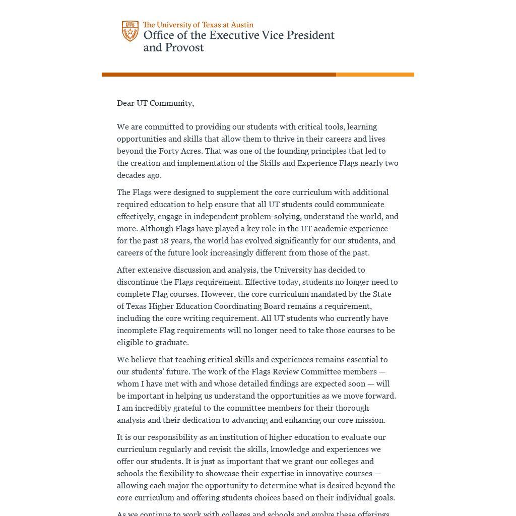 After extensive discussion and analysis, the University has decided to discontinue the Flags requirement. Effective today, students no longer need to complete Flag courses. However, the core curriculum mandated by the State of Texas Higher Education Coordinating Board remains a requirement, including the core writing requirement. All UT students who currently have incomplete Flag requirements will no longer need to take those courses to be eligible to graduate.