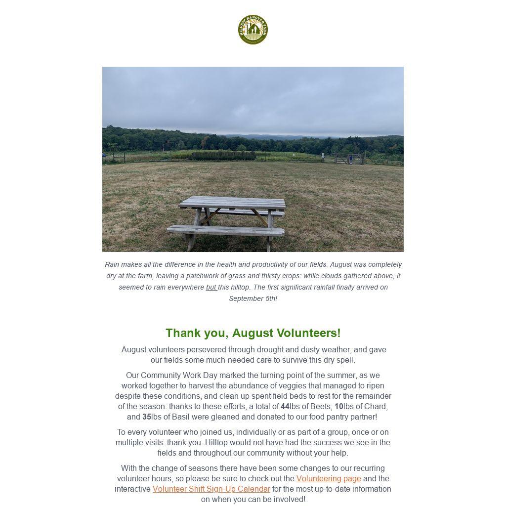 To every volunteer who joined us, individually or as part of a group, once or on multiple visits: thank you. Hilltop would not have had the success we see in the fields and throughout our community without your help.