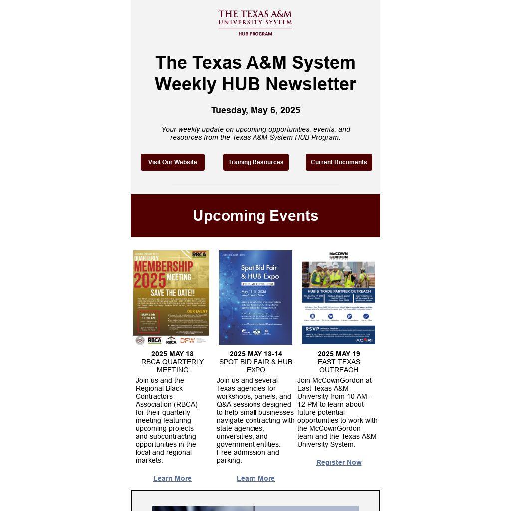 Your weekly update on upcoming opportunities, events, and resources from the Texas A&M System HUB Program.