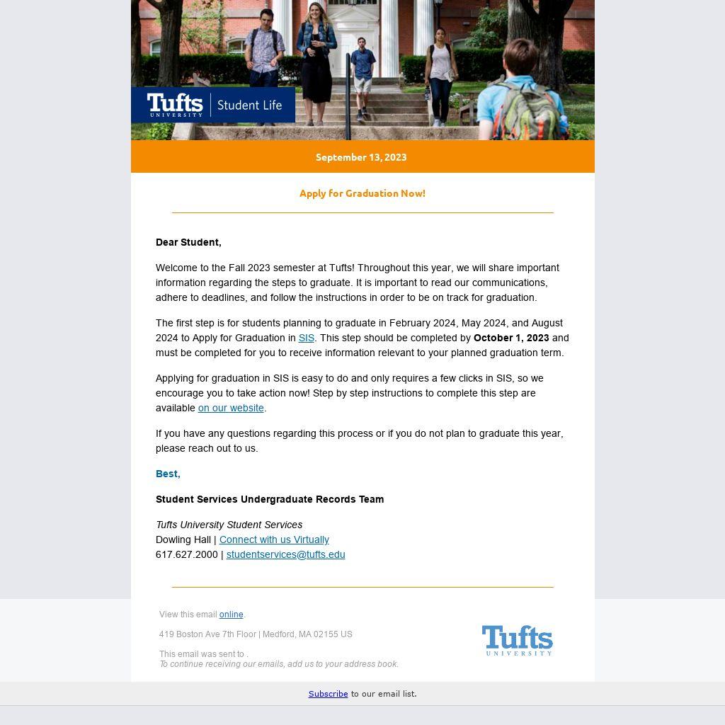 Welcome to the Fall 2023 semester at Tufts! Throughout this year, we will share important information regarding the steps to graduate. It is important to read our communications, adhere to deadlines, and follow the instructions in order to be on track for graduation.