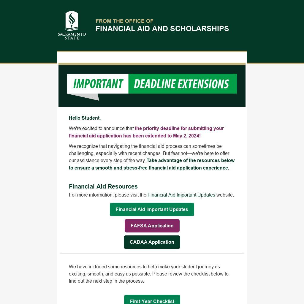 We're excited to announce that the priority deadline for submitting your financial aid application has been extended to May 2, 2024!