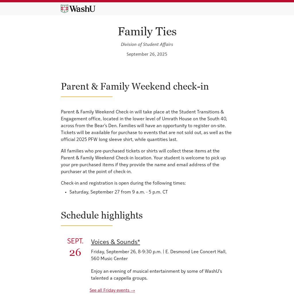 Parent & Family Weekend Check-in will take place at the Student Transitions & Engagement office, located in the lower level of Umrath House on the South 40, across from the Bear’s Den. Families will have an opportunity to register on-site. Tickets will be available for purchase to events that are not sold out, as well as the official 2025 PFW long sleeve shirt, while quantities last.